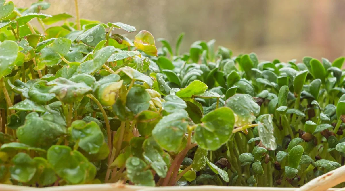 Buckwheat microgreens are mild, slightly earthy, and feature attractive pink stems and soft, heart-shaped leaves. They work well in salads and as a gentle garnish. Naturally rich in rutin (a beneficial antioxidant) and minerals, they provide nutrition with a delicate flavour.